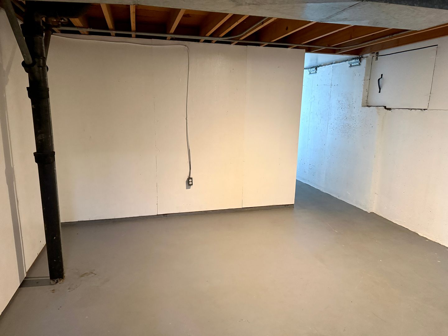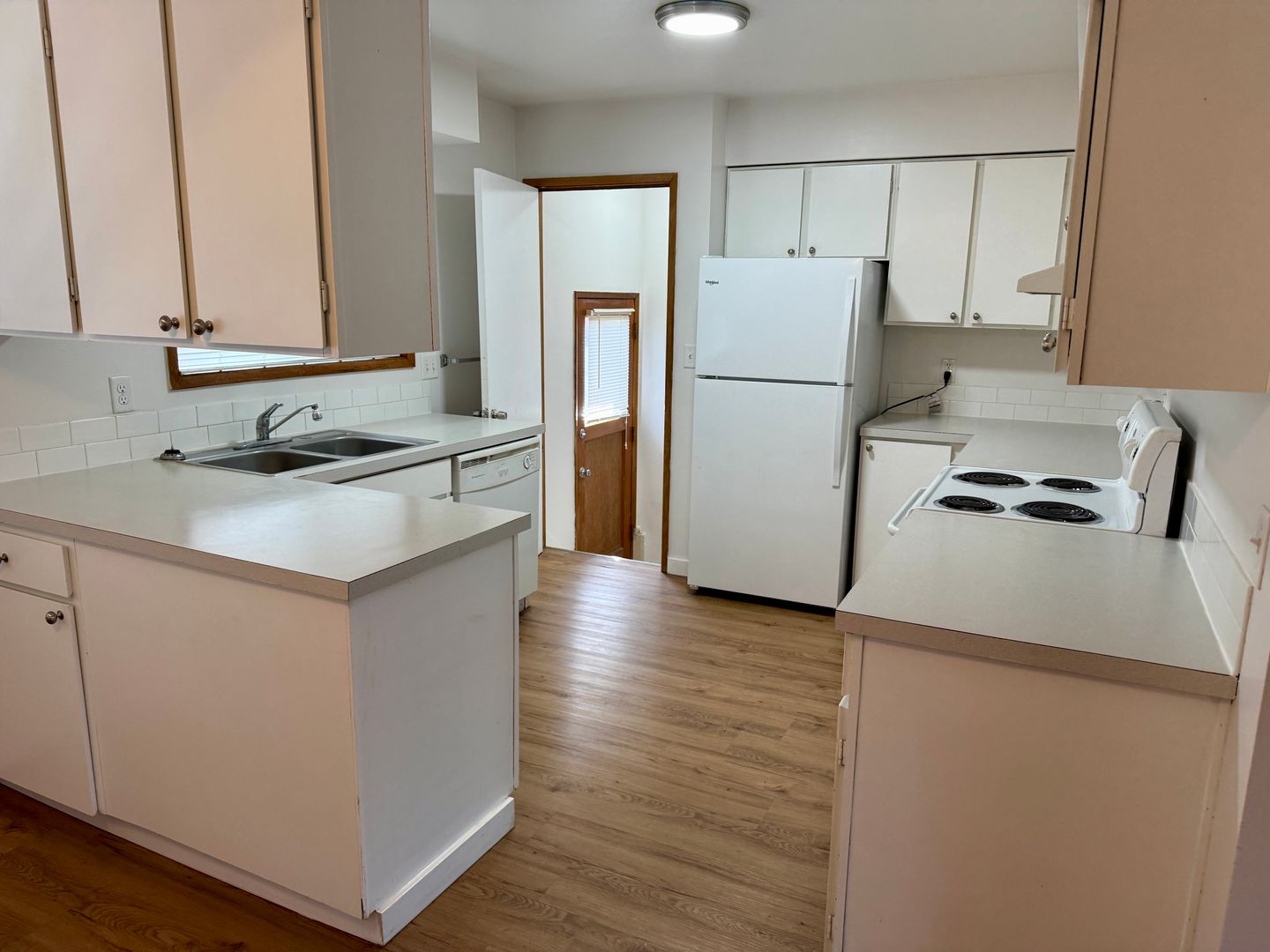 This 3 bedroom 1 bathroom unit in a mid-century mod triplex lives like a home, with laminate flooring, a fireplace, and a cool sky light in the living room. Down the hall to the right are the two main bedrooms' each 10x12. In addition the bathroom and two extra closets are here. Opposite of the living area is the dining room and kitchen you will find white cabinets and lots of counter space. Off the kitchen is an access to the semi-private alley (not big enough to be a yard, but big enough for some of your plants to call home. Back inside, and down the stairs is the third bedroom, open basement area, and the laundry area with addition storage too. Head forwards from there and down a long hallway from the laundry room you will find your extra deep one car garage.