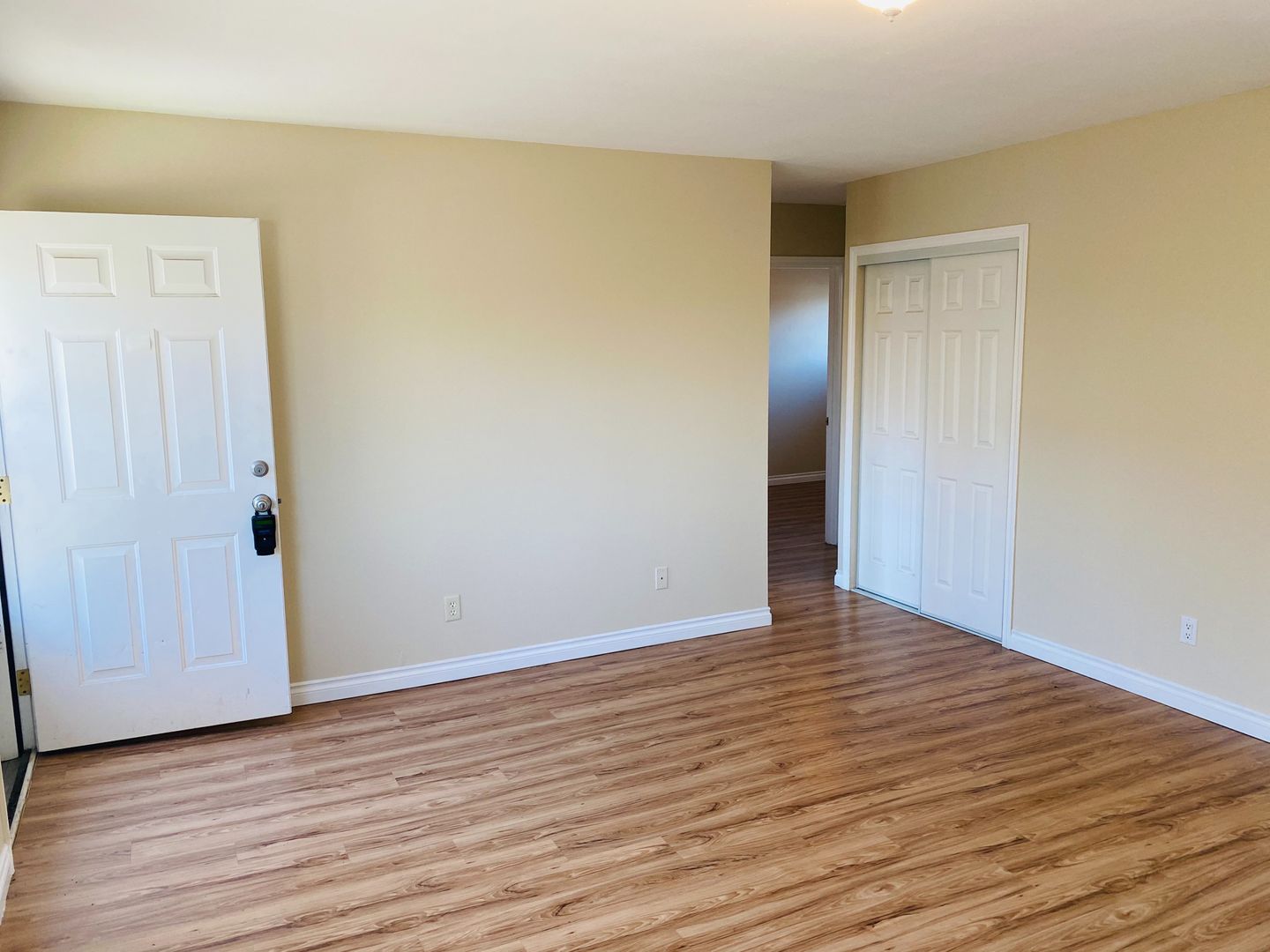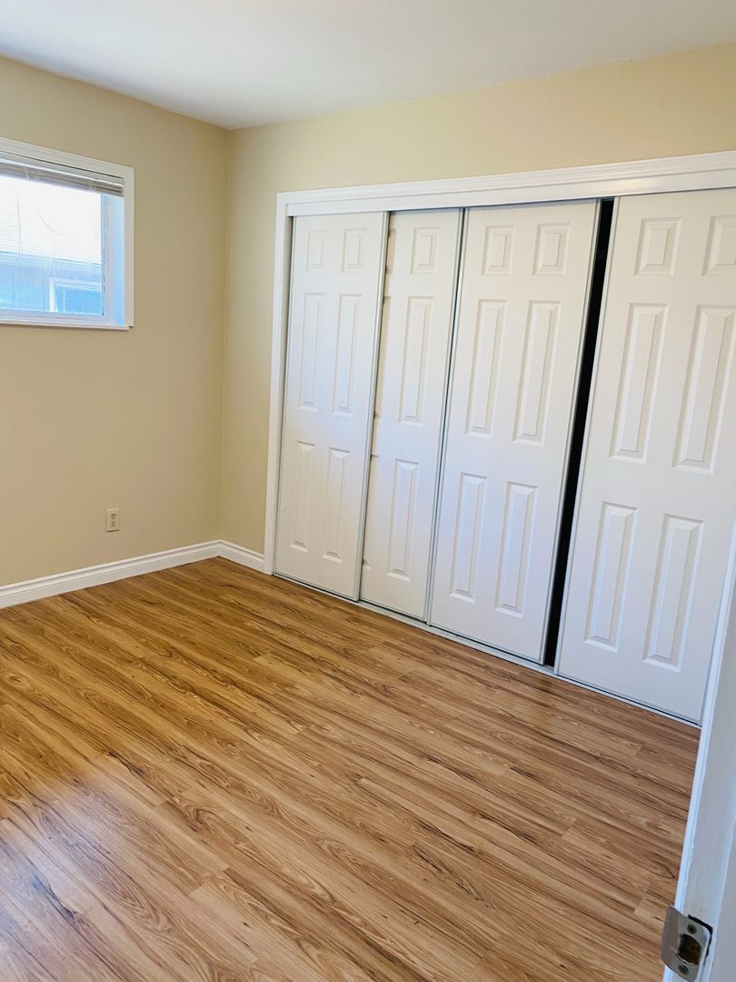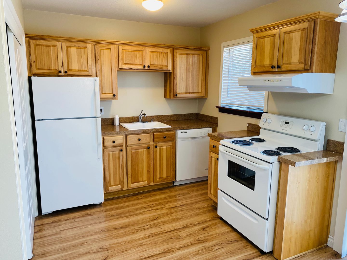 The living room, dining and kitchen feature wood-look laminate flooring. In the kitchen there is a large pantry, and the refrigerator, dishwasher and stove are provided. Off the dining room is a nice and private outdoor space with room to grill, and a bit more space to spread out too.