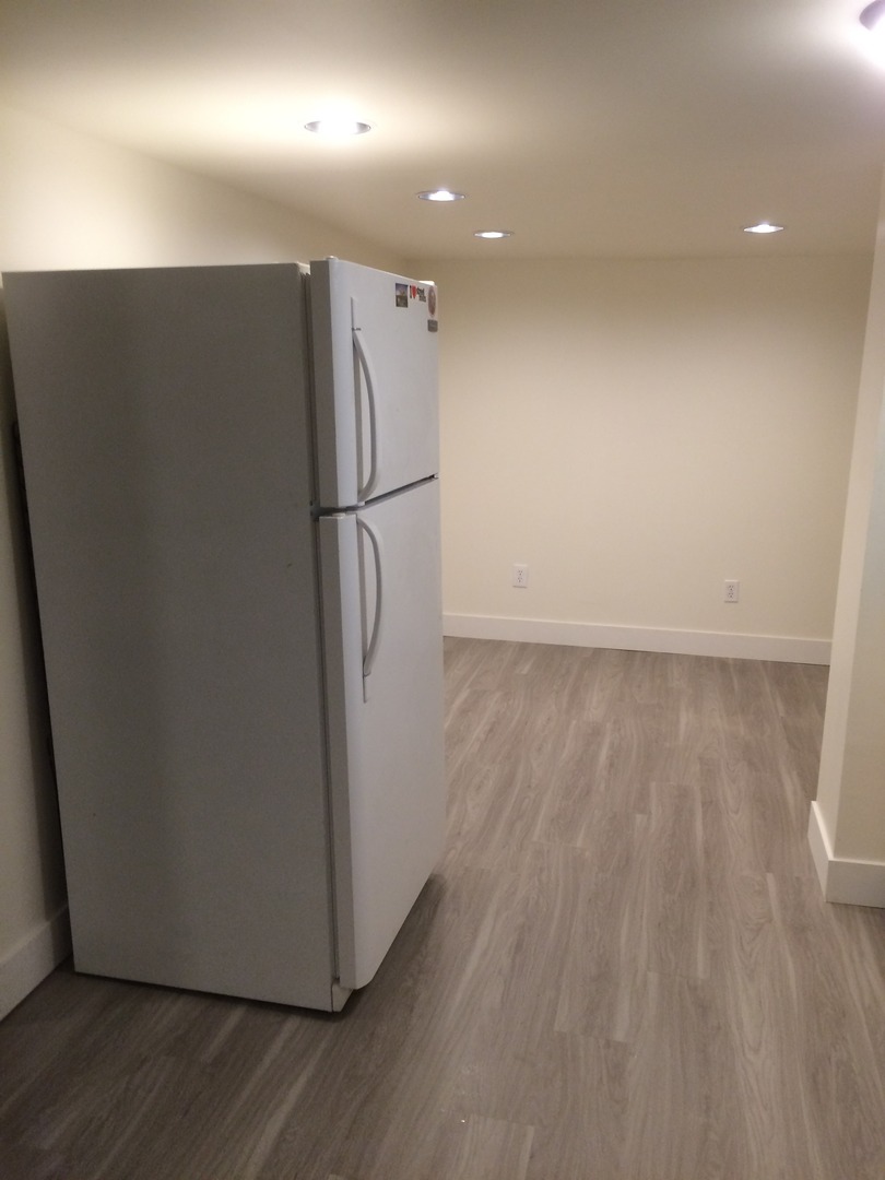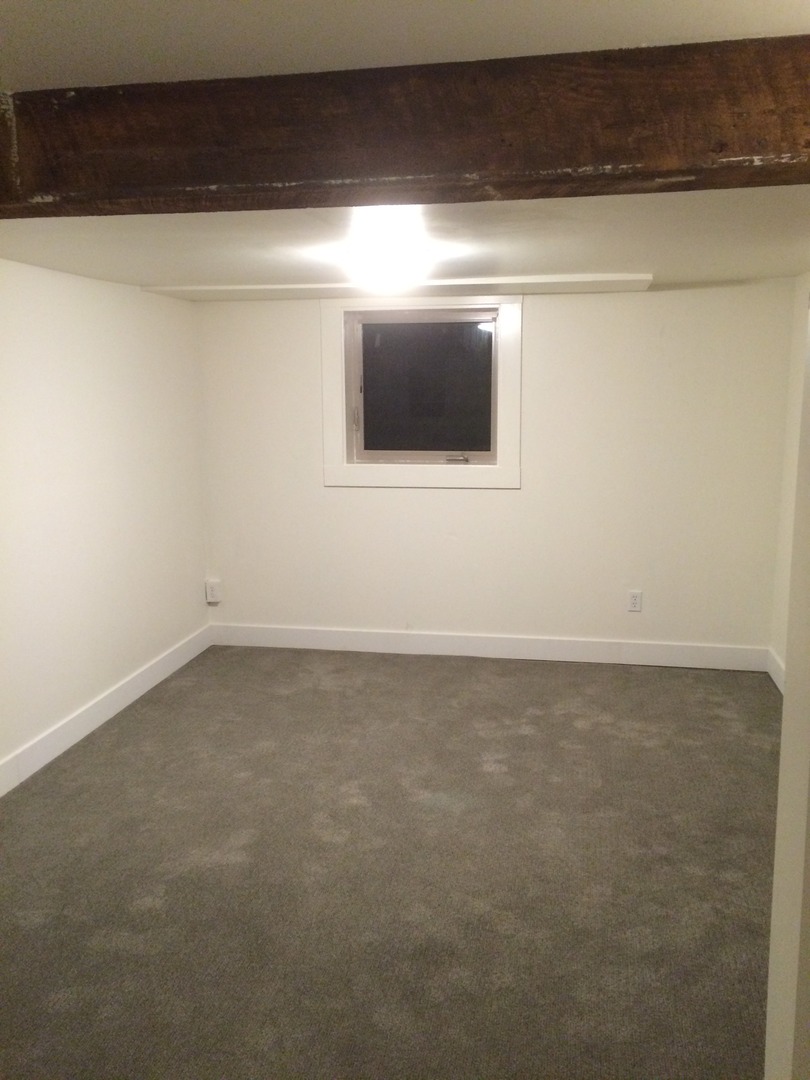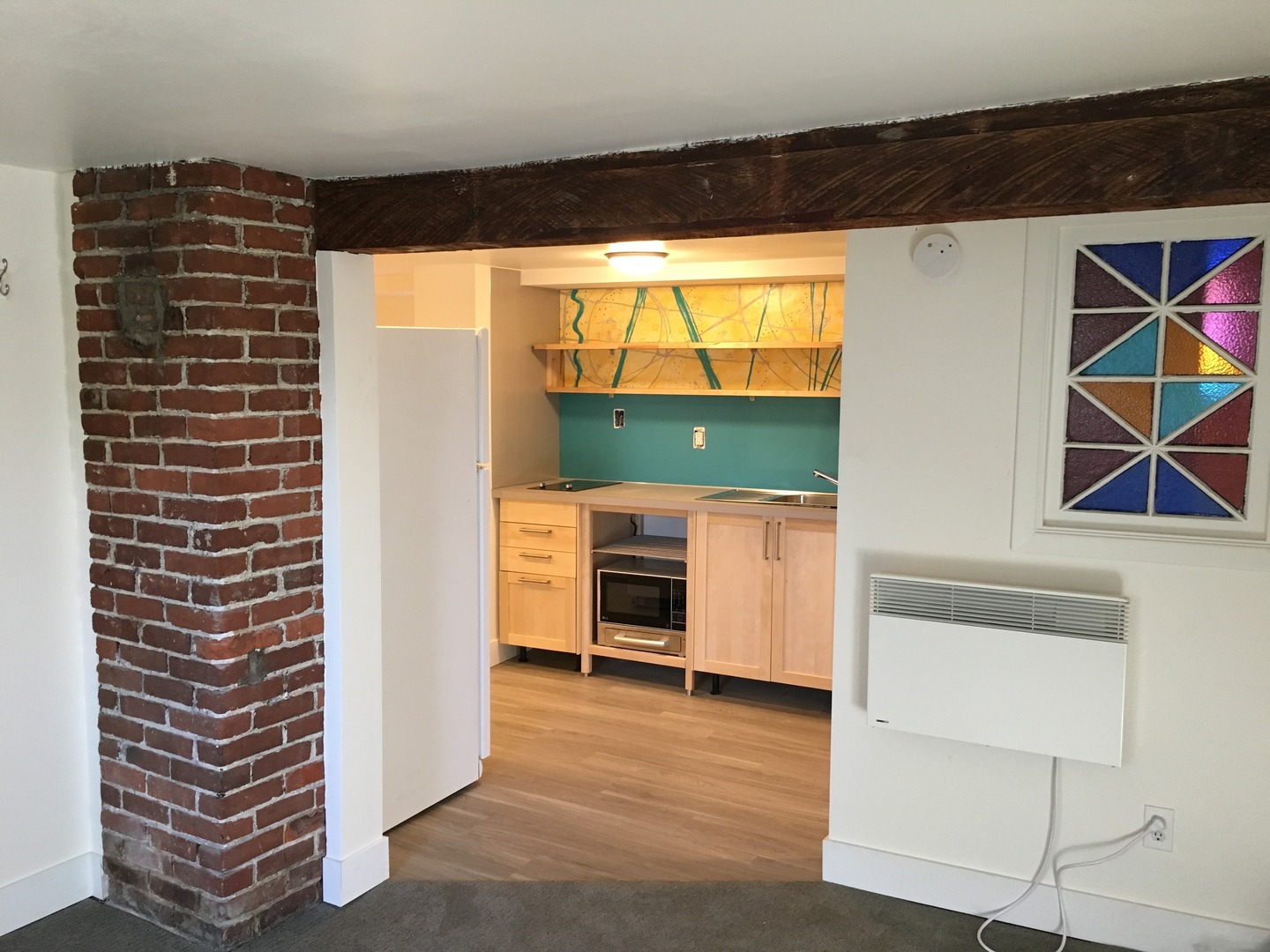 Tucked under and away, come see the cool exposed wood beam and brick chimney. The unit has been updated in with IKEA kitchen cabinets, modern appliances (including a microwave), counter tops, custom flooring and LED lighting throughout. It has a smart layout and is almost like a one bedroom unit with separate sleeping area and a full sized bathroom.